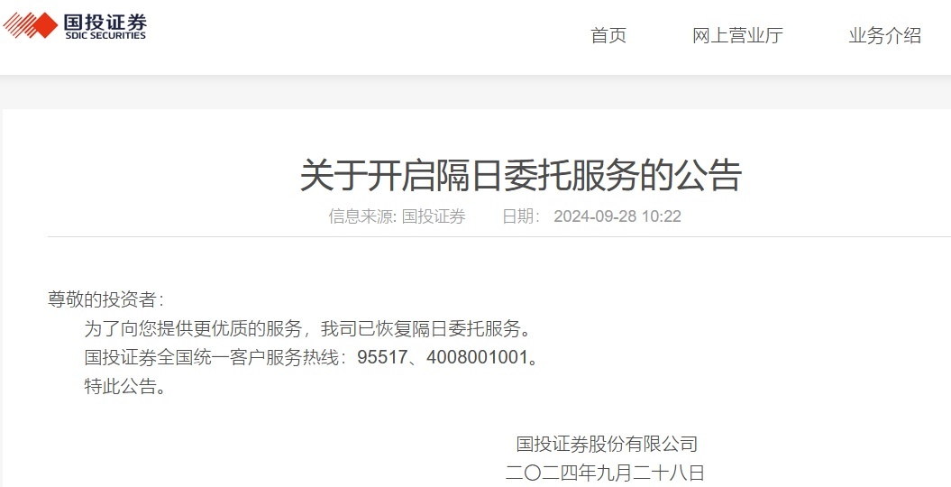 值得注意的是,国投证券在今早(9月28日)宣布已恢复隔日委托服务。