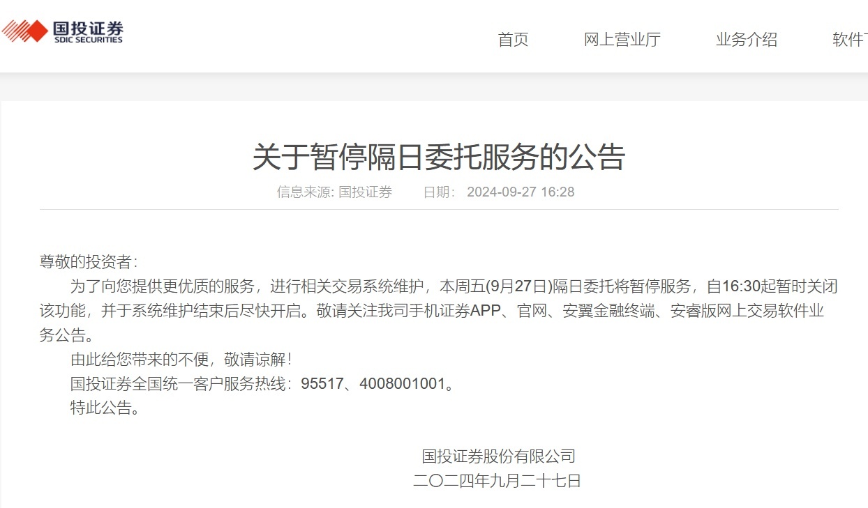 9月27日下午,国投证券公告称,自2024年9月27日16:30起暂时关闭隔日委托功能,关于隔日委托功能开启的具体时间,将另行通知。