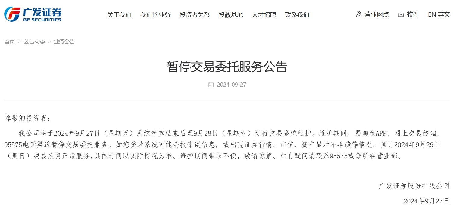 广发证券也发布公告,将于9月27日系统清算结束后至9月28日进行交易系统维护,预计9月29日(周日)凌晨恢复正常服务,具体时间以实际情况为准。